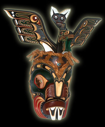 Carved from red cedar with acrylic paint and varathane - inlaid abalone and copper, dressed with Cedar bark rope