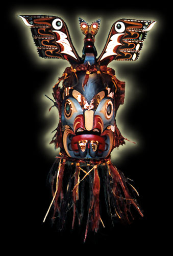 Carved from red cedar with acrylic paint and varathane - copper inlaid - abalone inlaid and dressing with natural and dyed cedar bark - all Canadian products -