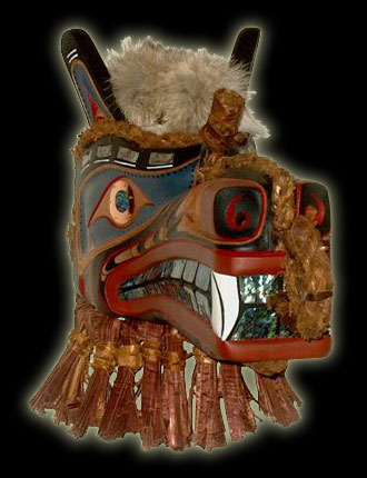 Carved from red cedar with acrylic paint and varathane - inlaid abalone and copper, dressed with Cedar bark