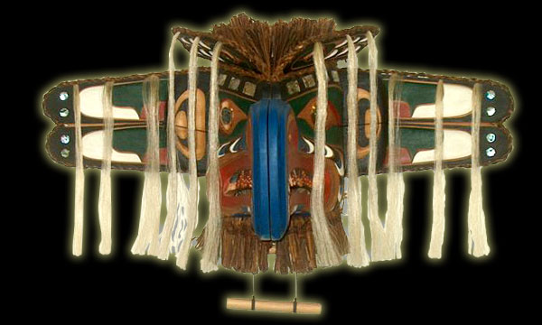 Carved from red cedar with acrylic paint and abalone and copper inlay, dressed with horse hair and cedar bark. Depth - 32" | Width closed - 42" | Width open - 52" | Height - 34"
